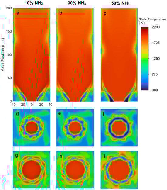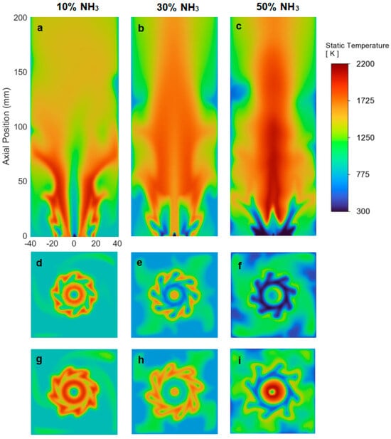 CFD simulated temperature contour plots of premixed flames at ϕ = 0.7, with different NH3/CH4 vol.% (a–c), and contour plots at different heights: H = 10 mm (d–f) and H = 20 mm (g–i).