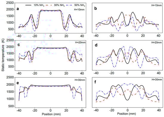 From Figure 9, the left column shows the temperature profiles of premixed flames at different heights. It can be observed that with an increase in the NH3 ratio, the changes in the high-temperature region in the middle are not significant, only slightly decreasing. However, the temperature fluctuations at the swirl exit are more pronounced. At H = 30 mm, it is evident that when the NH3 ratio is 50%, the flame temperature is significantly lower at approximately 0.35 m from the center compared to NH3 ratios of 10% and 30%. Combined with Figure 7, it is apparent that the height of the swirl flame changes, with the highest heat release region moving towards the exit and simultaneously approaching the wall.