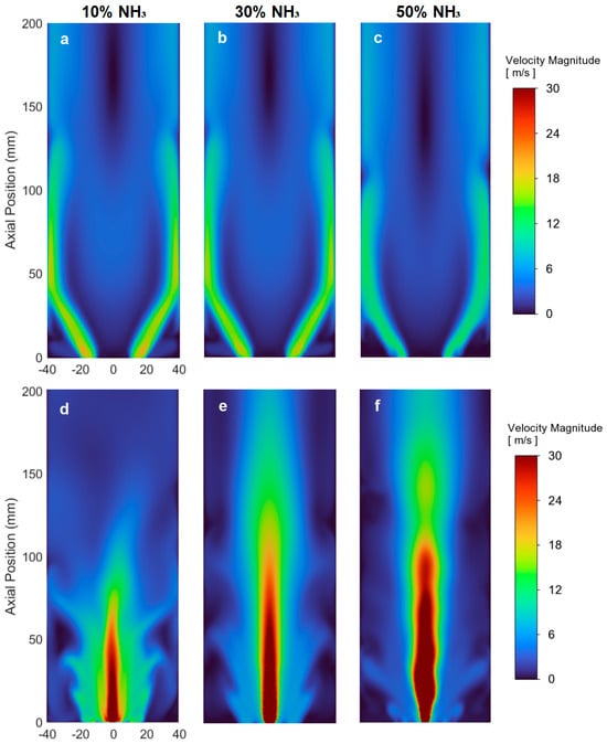 Figure 11 shows the velocity contour maps of the premixed and dual flames, revealing significant differences in velocity distribution between the two combustion modes. In Figure 11a–c, it can be observed that with an increasing NH3 ratio, the velocity peak of the premixed flame gradually decreases, and a noticeable recirculation zone appears. In Figure 11d–f, it is evident that as the NH3 ratio increases, the velocity of the central jet flame gradually increases, resulting in a higher flame height.