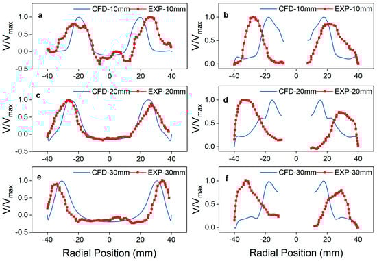 Figure 12 compares PIV measurements and simulation results at different heights from 10 mm to 30 mm. The absence of tracer particles in the central jet flame of the dual flame results in the flow velocity in the central area not being captured, leaving it blank and focusing solely on the comparison of the axial velocity field of the outer swirling flow. During data processing, all data were normalized to maintain consistency between CFD and PIV comparisons [].
