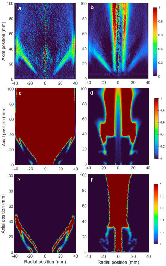 Comparison of experimental NH2* chemiluminescence Abel inversion (a,b) and CFD simulated thermal NO (c,d) and prompt NO (e,f) for premixed and dual flames, with ϕ = 0.7 for a 30% NH3/70% CH4.