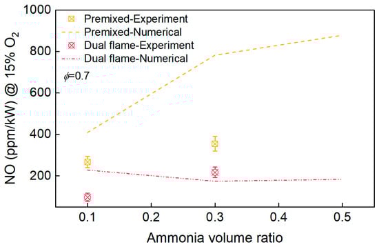 Figure 14 compares the experimental and numerical simulation results of NO emissions at ϕ = 0.7. As shown, the experimental results indicate that the NO emission values of the dual flame are lower than those of the premixed flame. As the NH3 proportion increases, the NO emission values increase, following the same trend for both premixed and dual flames. From the numerical simulation results, it can be seen that the NO emissions of the premixed flame are similar at an NH3 proportion of 10%. However, as the NH3 proportion increases, the NO emissions of the premixed flame increase significantly, whereas the NO emissions of the dual flame slightly increase at an NH3 proportion of 30% and slightly decrease at 50%. This discrepancy may be attributed to the influence of environmental factors and discrepancies between actual combustion and numerical simulation. The overall trend is consistent, indicating that NO emissions of the premixed flame are higher than those of the dual flame under the same operating conditions.