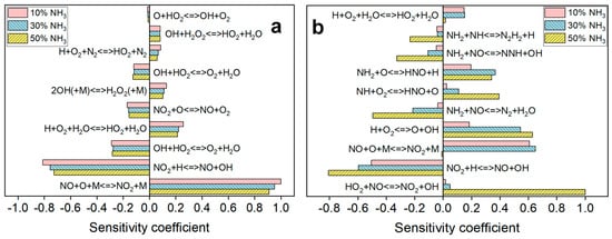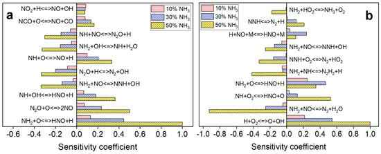 In contrast to the premixed flame, as shown in Figure 15b, the reaction NH2 + O ↔ HNO + H is not the most significant consumption reaction in the dual flame. It is evident that the reaction rate does not change significantly when the NH3 ratio increases from 30% to 50%, but the sensitivity coefficient at 50% NH3 is twice that at 10% NH3. The reaction H + O2 ↔ O + OH has the highest sensitivity coefficient in dual flame combustion, and the rate of OH formation increases significantly with the NH3 ratio.