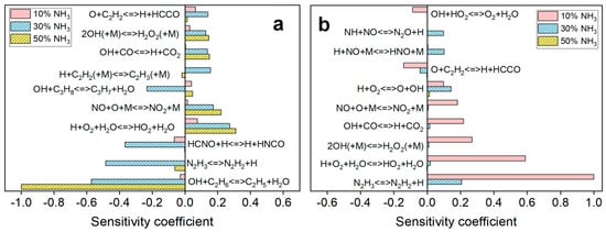 Additionally, for the reaction N2H3 ↔ N2H2 + H, the premixed and dual flames exhibit opposite trends. In Figure 17a, this reaction shows a negative coefficient, while in Figure 17b, it displays a positive coefficient, indicating that it is the strongest reaction in terms of sensitivity in the dual flame scenario. At an NH3 percentage of 10%, its sensitivity coefficient is roughly five times that at 30%; however, as the NH3 percentage increases to 50%, the sensitivity coefficient significantly decreases, nearly negligible compared to the 10% case, suggesting that the consumption of N2H3 diminishes with higher NH3 percentages. Conversely, in the premixed flame, the sensitivity coefficient decreases as the NH3 percentage increases, indicating that the generation of N2H2 is suppressed, becoming nearly insignificant at 10% NH3.