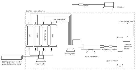 This experiment is mainly divided into four parts: injection, simulation, gas measurement, and data collection. The devices used in the injection part include the following: an ISCO high-pressure constant speed displacement pump, six-way valve, intermediate container, and pressure gauge. The experimental devices of the simulation part include the following: 100 cm core holder, back pressure valve, and thermostat. The devices in the gas measurement part include the following: gas–liquid separation device, liquid container, and gas flow meter. The experimental devices in the data collection part include sensors and calculators. In the injection stage, the ISCO high-pressure constant speed displacement pump ensures precise control of injection rates, while a six-way valve manages fluid direction. During the simulation stage, core samples are placed in a 100 cm core holder, and a thermostat maintains reservoir conditions, allowing us to monitor the displacement effect. In the gas measurement stage, a gas–liquid separation device records CO2 breakthrough points, and sensors collect real-time data on recovery rates and pressures, which are calculated in the final data collection stage. Figure 1 is the experimental flow chart.
