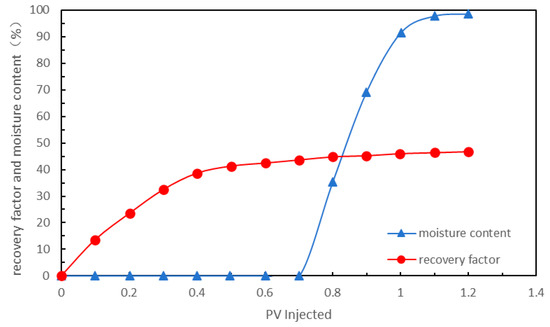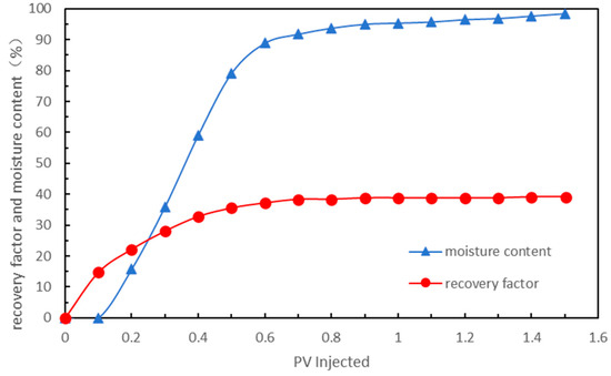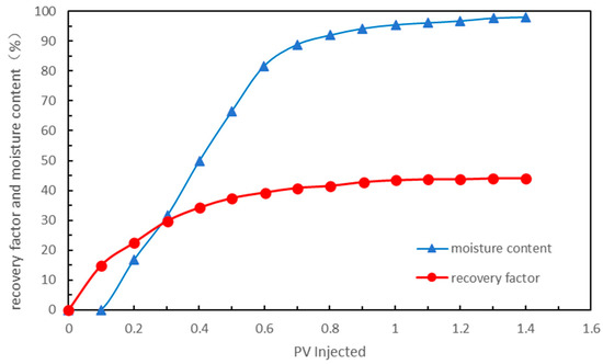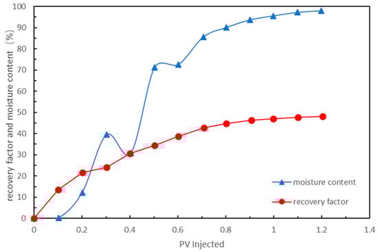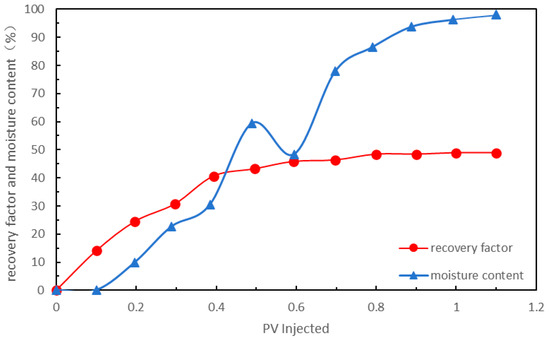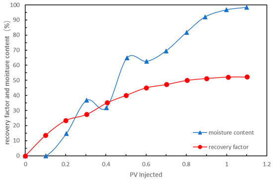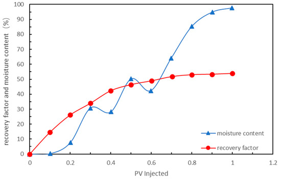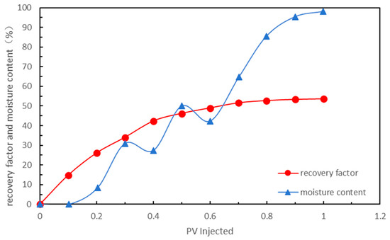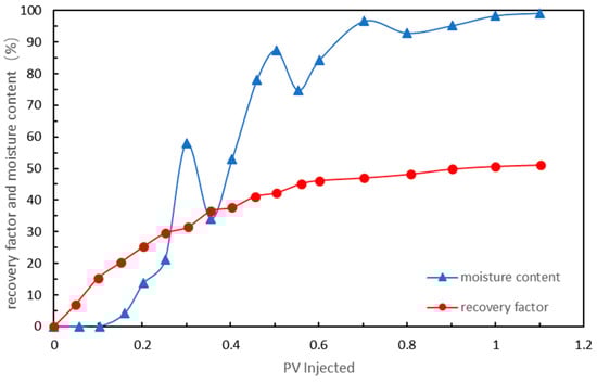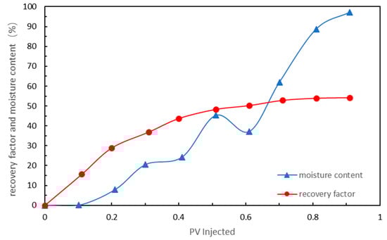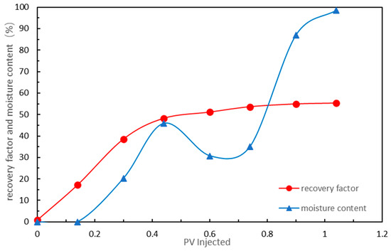 Figure 8, Figure 9, Figure 10 and Figure 11 show the change curves of recovery factor and water cut as a function of injection volume during modified water and CO2 alternating flooding at different modified water concentrations. In Figure 10, a significant improvement is observed when the modified water concentration reaches 0.3%, with a sharp increase in the recovery factor and a more controlled water cut. This concentration appears to be a turning point, achieving the best balance between reducing interfacial tension and altering rock wettability. The substantial increase in the recovery factor at this concentration suggests that the modified water effectively enhances CO2’s displacement impact. According to the experimental results, it is recommended that the mass concentration of the modified water formula system be 0.3% (when the mass concentration of modified water increases from 0.1% to 0.4%, an obvious inflection point appears at 0.3%).