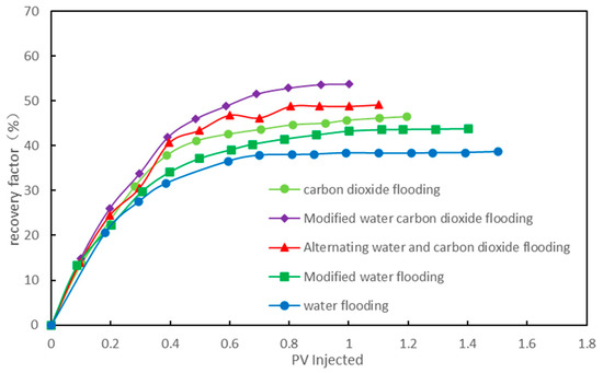 Water flooding, modified water flooding, CO2 flooding, water–CO2 alternating flooding (water/gas ratio 1:1, slug 0.1 PV, and total injection 0.6 PV), and modified water–CO2 alternating flooding (water/gas ratio 1:1). The oil displacement effect was evaluated using five displacement media (active agent concentration: 0.3%, slug: 0.1 PV, and total injection: 0.6 PV).