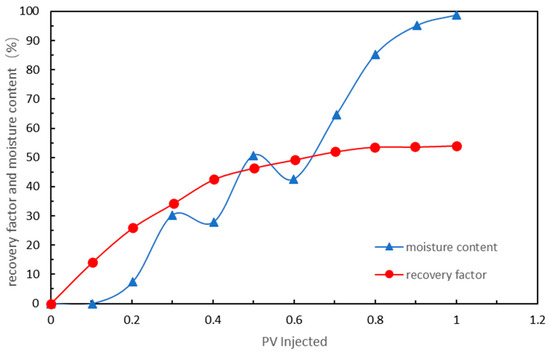Figure 2, Figure 3, Figure 4, Figure 5 and Figure 6 present the experimental results for the five displacement schemes. Figure 7 represents the comparison of recovery rates under different displacement methods. In Figure 3, modified water flooding improves the wettability of the rock surface and reduces the interfacial tension between water and oil by changing the properties of the injected water (usually by adding surfactants such as betaine). In Figure 4, CO2 injection introduces multiple physical and chemical interactions that enhance oil recovery. CO2 dissolves in the oil, causing it to swell and reduce viscosity. This swelling effect mobilizes trapped oil, allowing it to flow more easily to production wells, resulting in a recovery rate of 46.52%. In Figure 5, water–gas hybrid flooding alternates between water and gas (CO2 in this case) injections, combining the displacement power of water with the mobility control of gas. This alternation helps reduce the tendency of gas to escape through high permeability zones, thereby improving sweep efficiency. In Figure 6, by alternating between modified water and CO2, this method optimizes wettability changes and oil mobility through CO2-induced swelling. This hybrid method achieves the highest recovery rate of 53.64% by leveraging both enhanced wettability from the modified water and reduced viscosity from the CO2. The alternating process ensures that the modified water remains strongly interacting with the rock, while the CO2 continues to improve the mobility of the oil, allowing for a more complete displacement of the oil than with conventional methods. Experiments show that modified water and carbon dioxide alternative flooding in low-permeability reservoirs have obvious improvement and development effects (the water flooding recovery rate is 38.32%, the modified water flooding recovery rate is 43.73%, the carbon dioxide flooding recovery rate is 46.52%, the water and carbon dioxide alternating flooding recovery rate is 49.02%, and the modified water carbon dioxide alternate flooding recovery rate is 53.64%).