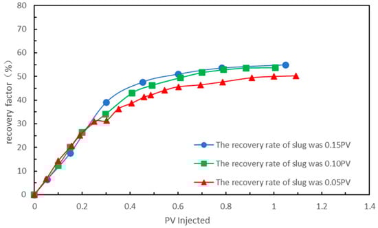 Figure 12, Figure 13 and Figure 14 show the modified water + CO2 alternating oil when the size of the segment is constantly changing the section of the plug, Figure 15 shows the comparison of recovery effects under different injection slugs. Increasing the slug size to 0.15 PV, as shown in Figure 14, leads to a decrease in displacement efficiency compared to the 0.1 PV slug. The larger volume appears to cause a higher water cut, indicating that excessive slug size may lead to an early breakthrough or unfavorable fluid distribution, reducing the overall sweep efficiency. According to the experimental results, it can be seen that the modified water + CO2 alternate segment is 0.1 PV(when the modified water + CO2 alternate segment has increased from 0.05 PV to 0.1 5 PV, there is a significant inflection point at 0.1 PV).