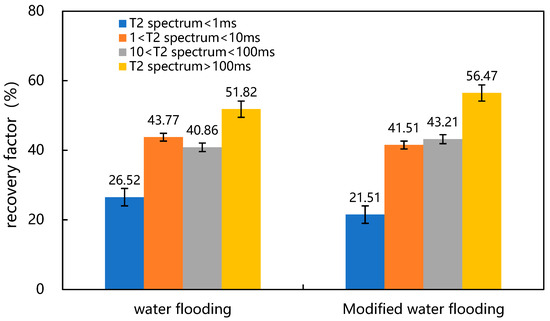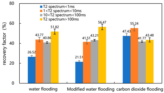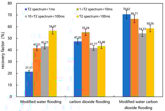 Figure 16 shows the oil-repellent efficiency in different size pores under different schemes. It can be seen that the carbon dioxide drive can greatly improve the efficiency of micropore driving (47.43% of the oil-repellent efficiency). In addition, CO2 oil-driven efficiency in small pores smaller than 1 ms is the highest among water drives and modified water drives, which is higher than water. The drive increases by 20.9%, an increase of 25.9% compared to the modified water drive; in the pores greater than 100 ms, the CO2 oil-driven efficiency is minimized in the water drive and modified water drive, which is 8.3% lower than the water drive at 12.9%. It can be seen from Figure 17 that alternating injection can further improve the oil displacement efficiency in micropores (the oil displacement efficiency reaches 70.6%). In small pores less than 1 ms, the modified water CO2 oil displacement efficiency is the highest, which is 49.2 higher than that of modified water flooding, which is 23.3% higher than that of CO2 flooding. The oil displacement efficiency increases more because the modified water is driven into small pores through the gas slug, thereby improving the displacement efficiency; from Figure 18, it can be seen that alternating injection can further improve the oil-repellent efficiency in the tiny pores (the oil-repellent efficiency is 70.6%). The driving increase is 49.2%, and the CO2 drive is 23.3%. The increase in oil-repellent efficiency is greater because the modified water is driven into the small pores through the gas segmentation to improve the driving efficiency. The oil-repellent efficiency in the pores (56.47%) and the efficiency of modified water repellent in small pores smaller than 1 MS is due to the large amount of molecular weight of the water drive, which is not easy to enter a smaller-sized pore. In the >100 ms pores, the modified water will improve the driving efficiency due to the effect of reducing the tension of the interface.
