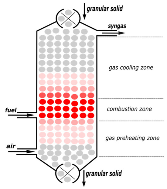 19]. In addition to the enhanced combustion temperature, the non-premixed process in a moving bed of granular heat carrier provides the technical means to convert various feedstock, ranging from methane to pulverized biomass, to syngas. This process was used and proved feasible for the gasification of heavy waste oil [