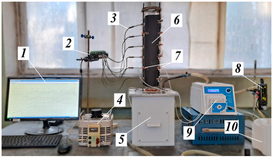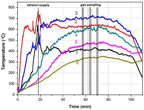 Upon nearly complete burnout of the char (~15–16 min), the granular solid bed was heated up to approximately 700 °C. Then the fuel supply was started and the air flow rate was set at the nominal value. The flow rate of the granular solid was also maintained at the prescribed value by discharging a portion of the solid from below once per minute by periodic operation of the rotating grate and refilling the layer at the reactor’s top with a preliminarily weighed portion of fresh solid. The level of the granular solid in the reactor was kept constant. The temperature in the reactor was measured using six K-Type (chromel–alumel) thermocouples (3). Readings of the thermocouples through an analog–digital converter (2) were transferred to a data acquisition computer (1) in real time.