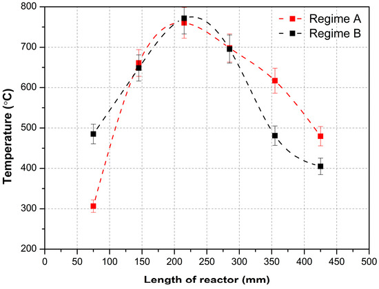 Table 2 presents the estimated values of the maximum temperature at the reactor wall and the estimated residence time for the varied air flow rates. The estimates of the residence time for gas flow in the high-temperature zone assume the width of the zone (h) where the temperature exceeds 900 °C (the temperature at which hydrocarbon conversion actively occurs). The estimate also takes into account the temperature gradient across the reactor cross-section: 300 °C was added to the temperature measured at the reactor wall to provide an estimate for the temperature in the center of the reactor. This temperature difference was directly measured [