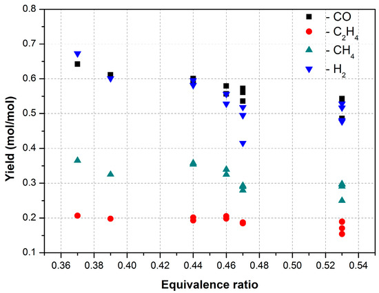 Figure 5). For α = 0.53, the figure shows the products’ yield at different heat carrier mass flow rates equal to 0.57, 0.87, 1.13, and 1.3. The composition of the gaseous products within scatter is practically independent of the heat carrier flow rate, indicating that heat losses in the laboratory-scale reactor dominate over other factors. Meanwhile, the dependence of the temperature measured at the reactor’s inner wall on the stoichiometric coefficient of excess air for this parametric range is weak (