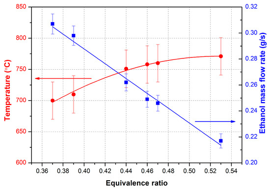 17], specifically for fuel consisting of ethanol with 4% water. For an air composition of 21 vol.% oxygen, 79% nitrogen was assumed. The initial enthalpies of ethanol and water used in the calculation were those of the liquids at room temperature. The enthalpies of all species according to NIST Standard Reference Database Number 69 [