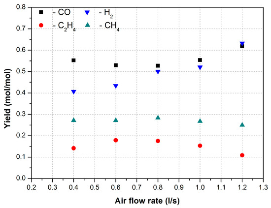 Figure 7 shows the dependence of the composition of the gaseous products on the air flow rate. As the air flow rate increases from 0.4 to 0.8 L/s, the yield of CO and CH