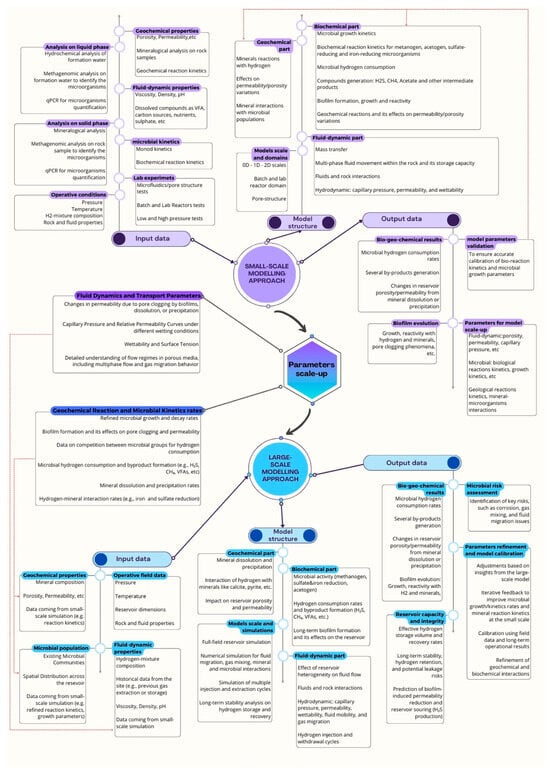 As we move to the large scale, reservoir models describe the pressure variations due to hydrogen injection, flow and distribution in porous media, the interaction between hydrogen and remaining hydrocarbons in the reservoir, such as methane, hydrogen diffusion, long-term geochemical changes in the rock and formation water, and the evolution of microbial populations over the storage life [23,26,39]. The transition from a small-scale to a large-scale model poses some significant challenges when it comes to incorporating the localized interactions captured in pore-scale models into the macroscopic fluid flow and heterogeneous properties of the reservoir [40]. In fact, biogeochemical modeling for UHS requires the integration of microbial growth equations, biological reactions, and geochemical processes across different scales.