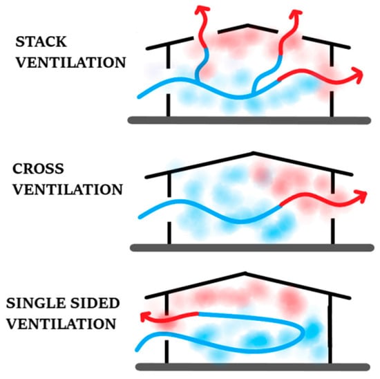 NV is dependent on passive airflow induced by natural elements like wind and thermal buoyancy. It entails utilizing operable windows, vents, and other apertures to facilitate the exchange of indoor and outdoor air. Consequently, its efficacy is affected by conditions ranging from window dimensions and placement, architectural design and orientation, and the effectiveness of automated window control systems [47]. NV can prove to be remarkably effective in preserving IAQ under moderate weather conditions, thereby diminishing the necessity for energy-intensive mechanical systems [30]. Nonetheless, in extreme climates or densely populated areas where high IAQ standards are imperative, ventilation rates that exceed the capacity of NV become essential [16,26]. Figure 3 shows the cross, stack and single sided NV.