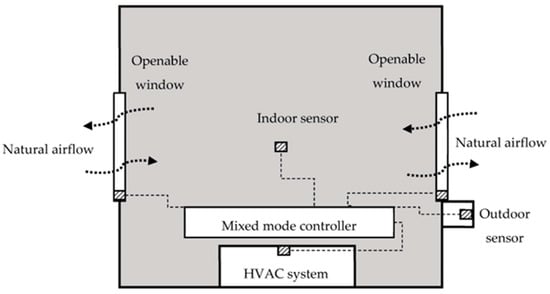 Most MV controls rely on Predictive Mean Vote (PMV) models as per ASHRAE standard 55 to assess indoor comfort [44]. Research has evaluated the effectiveness of an adaptive controls model that incorporates PMV. This control model can serve as a foundation for enhancements aimed at achieving optimal energy efficiency while ensuring a conducive indoor environment in educational facilities [76]. An effectively synchronized control system guarantees that NV and MV operate in harmony to avoid scenarios where MV counteract NV by providing heat while windows are open to allow in cool, outdoor air [80]. Figure 7 shows a basic illustration of an MMV control model with integrated operable windows and vents, HVAC system, and indoor and outdoor sensors.