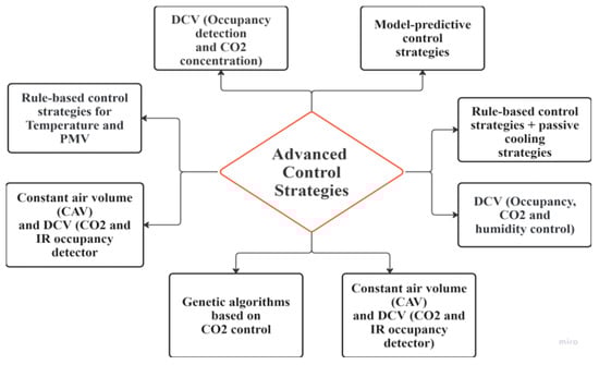 Optimizing heating and cooling to attain and maintain the right thermohydrometric conditions in building spaces has significance for energy use [68]. Many studies have explored ways to improve an MMV system’s energy consumption while maintaining the optimal IAQ [49]. Aside from building design improvements, advanced controls’ integration in a building energy management system is a major element for achieving the maximum efficiency of the ventilation system. Recent years have seen an improvement in sensor technology, artificial intelligence, and advanced computational power, making it possible to develop highly efficient control architecture to attain this goal [78]. The challenge revolves around how to effectively combine and coordinate the operability of NV windows, vents, and openings with a mechanical air conditioning system [38]. The desired level of energy savings can only be attained in MMV school facilities when the control architecture succeeds in establishing the opening and closing periods of windows in a timely manner to respond to variations in internal and external environmental conditions. The difficulty lies in establishing the conditions that trigger the switch [79].