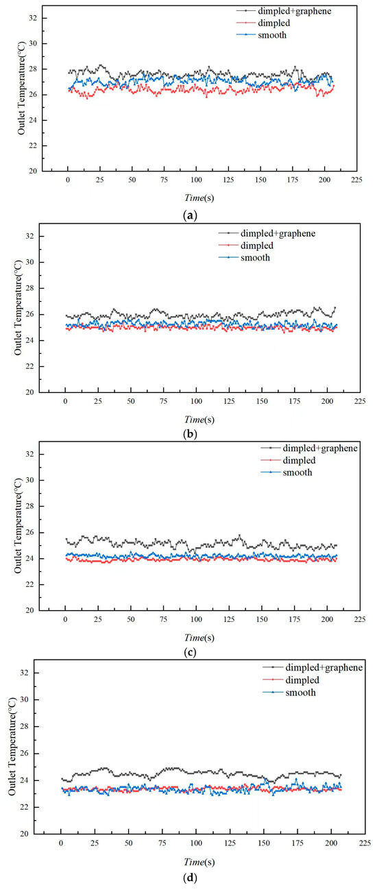 As shown in Figure 12a–g, the comparison results of the average outlet temperature of three experimental samples under a wind speed of 0.8–2 m/s are presented. From the graph, it can be concluded that, under each operating condition, the average temperature at the outlet of the electric heating element coated with graphene on the surface is the highest. Comparing Figure 12a–d, it can be found that the outlet temperature of the electric heating element with a concave structure is lower than the smooth surface, indicating that the addition of a concave structure reduces the heat dissipation of the electric heating element; however, comparing Figure 12e–g, it can be found that the outlet temperature of the electric heating element with a concave structure is higher compared to smooth surfaces, and the heat dissipation of the concave-structure electric heating element is also higher. In summary, it was found through experiments that the heat dissipation of electric heating elements with concave structures has a critical Reynolds number of Re = 2330.