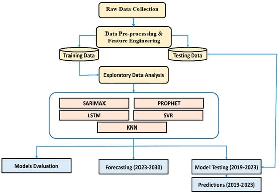 - A number of machine learning models, such as linear regression (LR), seasonal autoregressive integrated moving average with exogenous variables (SARIMAX), support vector regression (SVR), Prophet, k-nearest neighbors (k-NN), and long short-term memory (LSTM) networks are tested and compared under the identical training and testing datasets, and the best among all is recommended to researchers in the studied field of research.