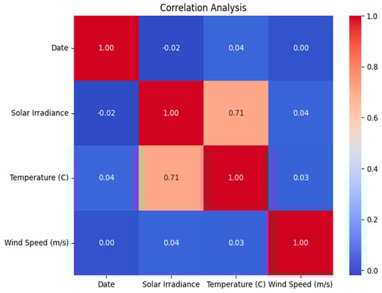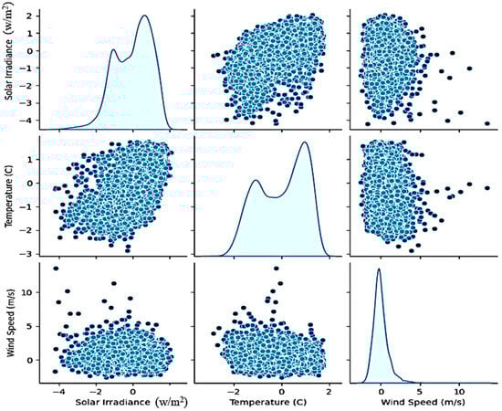 In this specific case, the heat map includes four variables: the date, solar irradiance, temperature, and wind speed. The heat map employs shades of blue and red to indicate the strength and direction of the correlations. From the heat map, we observe a notable positive correlation between solar irradiance and temperature, with a correlation coefficient of approximately 0.71, suggesting that an increase in solar irradiance tends to be associated with a rise in temperature. Conversely, the correlation between solar irradiance and wind speed is weak, with a coefficient of around 0.04, indicating that the wind speed does not significantly influence solar irradiance. Similarly, the relationship between temperature and wind speed is minimal, with a negligible positive correlation of approximately 0.03, showing that wind speed has little impact on temperature. As expected in a correlation matrix, the diagonal from the top left to the bottom right shows perfect positive correlations of 1.00 for each variable within itself. A series of nine scatter plots organized in a 3 × 3 grid, each illustrating the relationship between different pairs of three variables, solar irradiance, temperature, and wind speed, is shown in Figure 4.