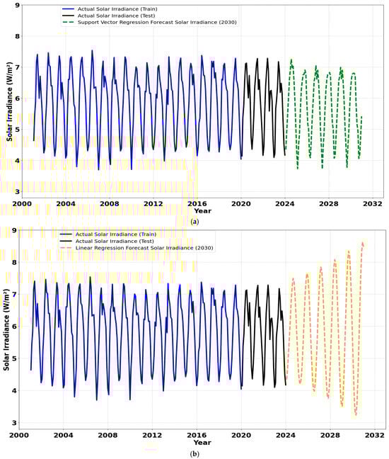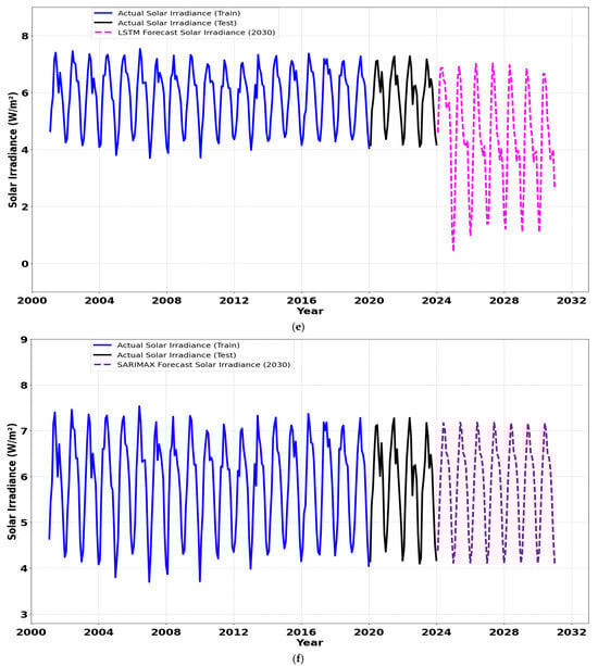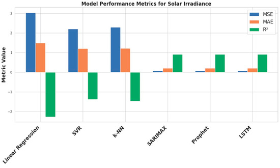 Solar irradiance was forecasted for Muscat, Oman, using machine learning algorithms like linear regression, SVR, k-NN, SARIMAX, Prophet, and LSTM for the period 2024 to 2030. Further, the model’s accuracy was evaluated using the MSE, MAE, and R2 scores. For solar irradiance, the SARIMAX model demonstrates superior performance, with an MSE of 0.0746, an MAE of 0.2096, and an R2 score of 0.9197. This indicates that the proposed algorithm captures the variability in the solar irradiance data effectively, thus providing the most accurate forecasts for time-series multiple-feature-based solar irradiance forecasting. The findings of this article provide a solid framework for long-term solar power forecasting at a particular location; however, it can be extended to any general forecasting application provided with the metrological data of the studied site. In addition, the current research work can be extended to include the load profile of the studied city and, consequently calculation of the solar power generation requirements in the future based on current solar irradiance predictions.