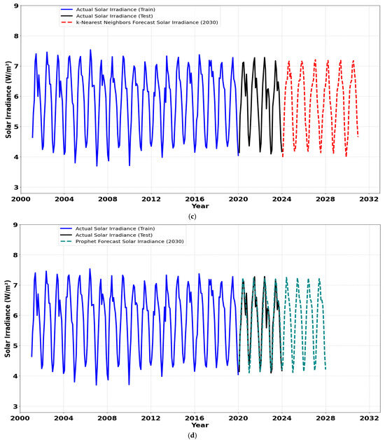 In this study, we examine the performance of various machine learning models for forecasting solar irradiance. The training data span from 2000 to 2019, while the testing data covers the period from 2020 to 2023. The models then generate forecasts for solar irradiance from 2024 to 2030. However, we present an in-depth analysis of the k-NN, linear regression, SARIMAX, Prophet, SVR, and LSTM models, including the observed highest and lowest values in each graph. Figure 5 shows the outcomes of the solar irradiance prediction made by each of the mentioned algorithms under identical datasets and selected features using the developed ML-based framework.