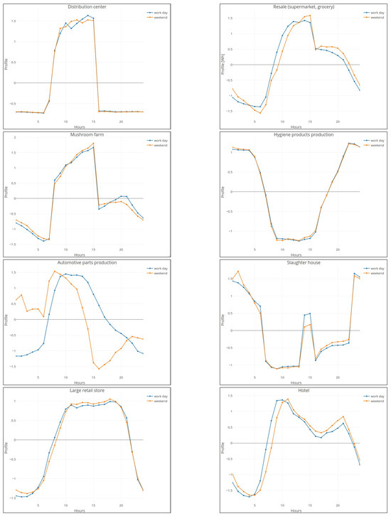 Table 1 is as follows: cluster 1 (c1) contains customers whose profiles are similar to those of a distribution center; cluster 2 (c2) includes customers with profiles resembling those of automotive parts production; cluster 3 (c3) is typical for resale; cluster 4 (c4) consists of profiles similar to hygiene products production; cluster 5 (c5) represents profiles typical of a mushroom farm; cluster 6 (c6) is typical of a large retail store; cluster 7 (c7) contains profiles typical of a hotel; and cluster 8 (c8) includes profiles similar to those of a slaughterhouse.
