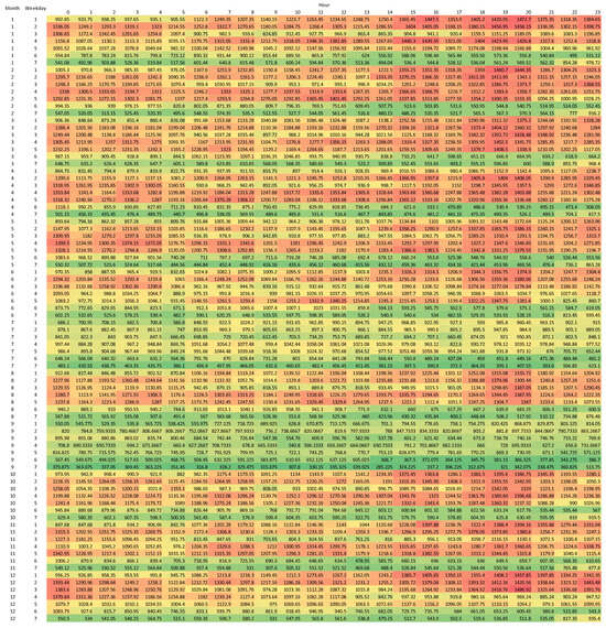 Figure 3. In this matrix, each cell represents the average consumption during each hour, calculated based on four or five measurements—for instance, the average for four Mondays (weekday = 1) in January (month = 1) of 2019. The matrix uses color coding to indicate consumption levels, with red cells representing increased consumption and green cells indicating lower consumption.