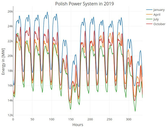 Figure 4 shows the weekly volatility in the load in the Polish power system in 2019 for the first two weeks of January, April, July, and October, i.e., months that represent the seasons. Higher peak loads in the winter (January) are associated with greater energy needs for electric heating or heating pumps, while lower peaks are observed in summer or spring. Additionally, the highest peak loads occur on working days, lower ones on Saturdays, and the lowest on Sundays and public holidays.