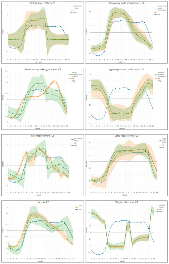 The profiles associated with the various clusters and selected industries were plotted against the Polish power system (PPS), as shown in