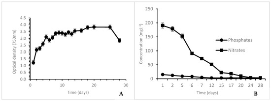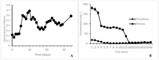 The growth of T. obliquus in the RW was followed for 35 days (Figure 5A). The maximum growth rate was attained within the first 11 days (μ = 0.43), where the corresponding volumetric productivity was 0.32 g L−1 day−1 (Table 1). The nutrient uptake during the growth of T. obliquus is presented in Figure 4B for the PBR growth and Figure 5B for the RW growth. In the PBR, nutrients were slower during the first 10 days but then accelerated, resulting in an average nitrate uptake rate of 8.6 mg L−1 day−1. Phosphate absorption, on the other hand, occurred gradually and in proportion to the PBR growth of Tetradesmus throughout the cultivation period, and it was 0.9 mg L−1 day−1. In the RW culture, nitrate uptake exhibited a rapid phase during the first 5 days, with a rate of 12 mg L−1 day−1. This was followed by slower uptake over the next 10 days before increasing again toward the end of the experiment. On average, the nitrate uptake rate was 5.2 mg L−1 day−1. This pattern suggests potential for optimization in nutrient availability to sustain consistent biomass production throughout the cultivation period. The phosphate uptake was constant during the RW growth, with an average rate of 0.75 mg L−1 day−1 (Figure 5B).