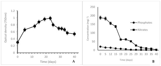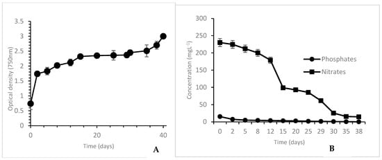 Growth and nutrient uptake of Tetradesmus obliquus in the PBR receiving CO2 waste gas from a local brewery on site. (A) The growth data in three biological replicates were measured using the optical density (OD) at a wavelength of 750 nm. (B) Nutrient uptake of L. maxima culture during the growth, measured via the nitrate and phosphate concentrations in the supernatants in three replicates.