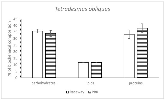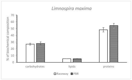 Harvesting of the biomass was performed when the cultures reached a stationary phase; T. obliquus was at an OD750nm of 2.5 for the PBR and 0.6 for the RW, while L. maxima was at an OD of 3.5 for the PBR and 0.8 for the RW. The biomass biochemical compositions of the two species grown in the PBR and RW are presented in Figure 6. The L. maxima biomass contained 48–55% proteins, 27–28% carbohydrates, 5% lipids, and 3% phycocyanin, while the compositions were not significantly different (p < 0.05) between the two cultivation systems. The T. obliquus biomass contained 33–38% carbohydrates and proteins and ~11.8% lipids without significant differences (p < 0.05) between the two systems.