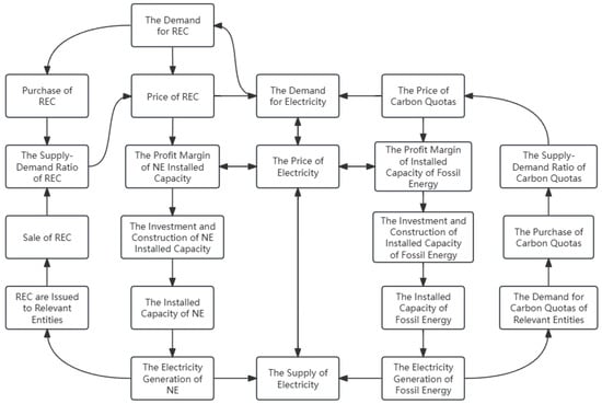 The EM, CEM, and RECM are interrelated by generation companies based on fossil energy and renewable energy and interact through electricity prices, carbon emission rights prices, and renewable energy certificate (REC) prices, as well as numerous endogenous and exogenous variables (Figure 1).