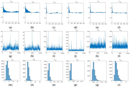 Estimation of model parameters: (a–f) autocorrelation function of samples, (g–l) simulated value path of samples, (m–r) density function of the posterior distribution.