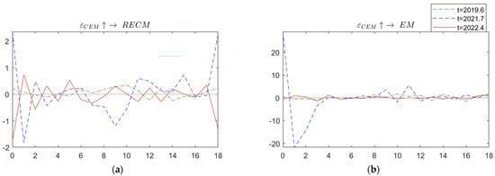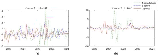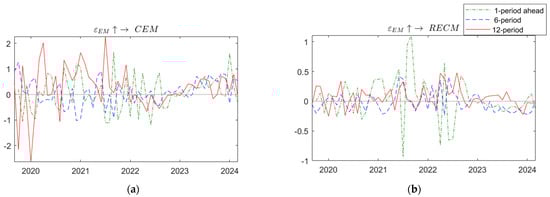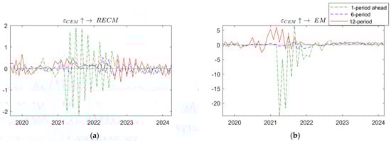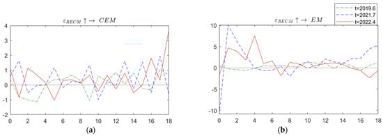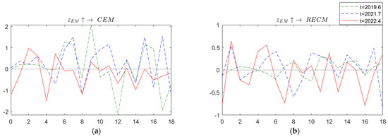 Figure 7a,b shows the impulse response of the CEM to EM shock and the impulse response of the RECM to EM shock, respectively. Figure 8a,b shows the impulse response of the CEM to EM shocks and the impulse response of the RECM to EM shocks for June 2019, July 2021, and April 2022, respectively.