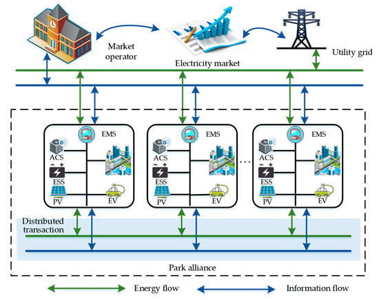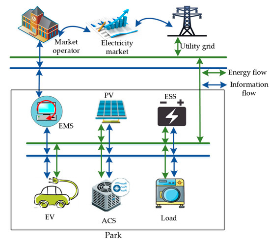Parks aggregate various distributed resources, including flexible assets, such as PVs, ESSs, EVs, and ACSs. These resources are effectively integrated and managed through advanced EMSs, facilitating efficient scheduling and coordinated operation [30]. One of the significant advantages of such parks is their ability to adapt flexibly to external environmental factors and internal demand fluctuations. For example, real-time monitoring of weather conditions and consumption patterns allows the system to dynamically adjust PV power generation, manage ES, and optimize ACS operations, thereby maximizing energy efficiency and minimizing waste.