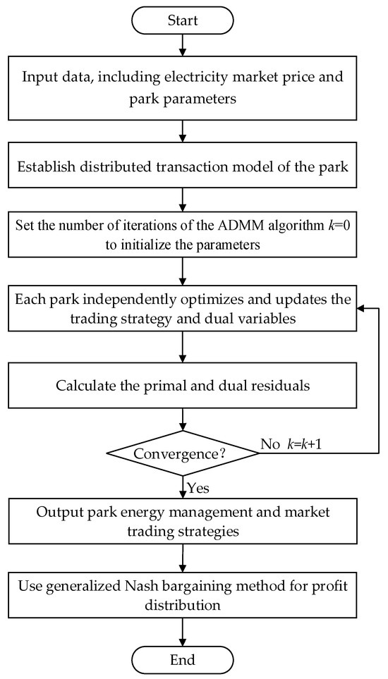 The park transaction model is addressed through a distributed approach using the ADMM algorithm. The detailed process unfolds as follows: