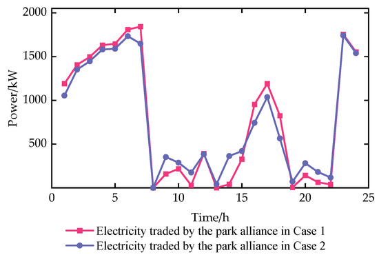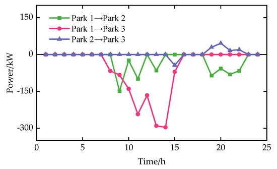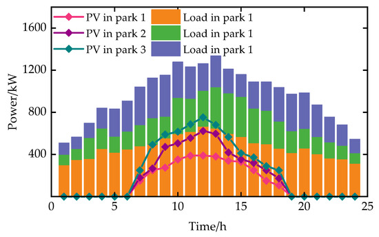 To evaluate the proposed method’s effectiveness, a test case was conducted by forming a cooperation alliance with three parks, as illustrated in Figure 2. Each park is assumed to be equipped with PVs, ESSs, ACSs, EVs, and other devices. The transaction prices between the parks and the superior power grid are based on time-of-use pricing, as detailed in Table 1. The projected PV power output and base load for the parks are presented in Figure 4. Each park is assumed to host 100 EVs, with grid connection times specified from 20:00 to 08:00 the following day. The maximum charging and discharging power for the ES is set to 100 kW, while the storage capacity is limited to [60, 300] kWh. Both the charging and discharging efficiencies are established at 0.9. This model is solved using the MOSEK solver within GAMS 24.4 software. In the ADMM algorithm, the initial value for the electric energy trading dual multiplier is set to 0, and the penalty factor is set to 0.01. Additionally, the upper limits for both the primal and dual residuals are established at 10−3. All experiments were conducted on a personal computer equipped with a 2.6 GHz CPU and 16 GB memory.