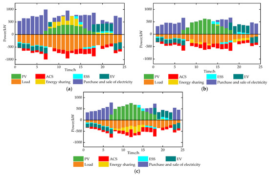 Figure 5 presents the energy management strategy for the park, where positive power represents electricity generation and negative power reflects consumption. All parks are equipped with ESSs, EVs, and ACSs, resulting in similar electricity consumption trends. ESSs and EVs are charged during morning hours when electricity prices are low and discharged during evening hours when prices are high, aiding in peak shaving. Meanwhile, ACSs use electricity to sustain the required temperature levels. There will be no sudden and significant changes in the load of each park.