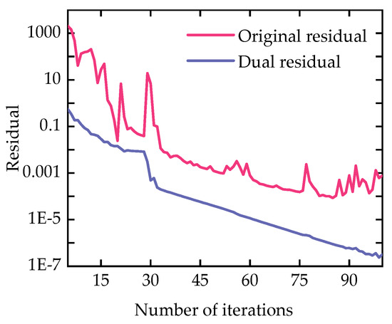 where and denote the convergence thresholds for the primal and dual residuals, respectively.