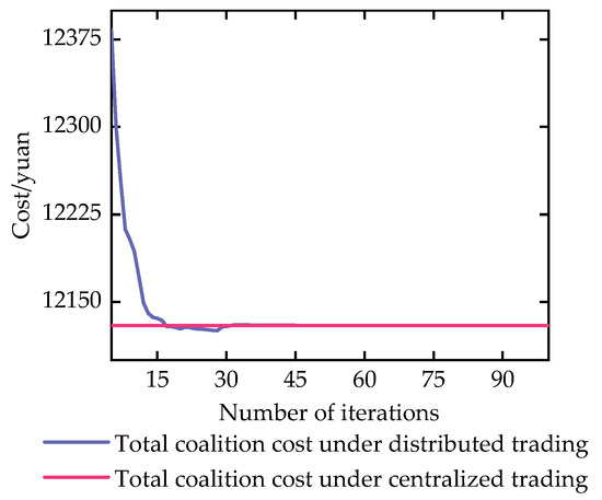 To further validate the effectiveness of the ADMM algorithm, the distributed transaction model for six parks was solved using the ADMM approach. The convergence of the primal and dual residuals is illustrated in Figure A1. The model converges after 113 iterations, with a computation time of 124.2 s. To satisfy the day-ahead scheduling and transaction requirements, the total cost iteration of the park alliance is presented in Figure A2. At the 113th iteration, the total cost of the distributed transaction matches that of the centralized transaction, demonstrating that the total cost of the park alliance under the distributed transaction framework converges rapidly to the centralized transaction cost. This ensures transaction accuracy and further validates the effectiveness of the proposed algorithm.