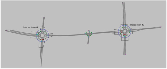The model was created using PTV VISSIM version 25. The model was built using real traffic measurement data from the city of Warsaw. Warsaw, the capital of Poland, is located in Central Europe. Figure 1 below shows the layout of the studied road segment. The studied road network consists of a roundabout, an intersection, and another roundabout. The morning peak period, characterized by exceptionally high traffic volume due to the proximity of residential areas, was examined. Some evaluation was conducted via node evaluation. Node evaluation was especially used to determine specific data from intersections without first having to define all sections manually in order to determine the data. In Figure 1, the measurement area of the node is highlighted by a black line. Table 2 shows the distance from the stop line to the edge of the node.