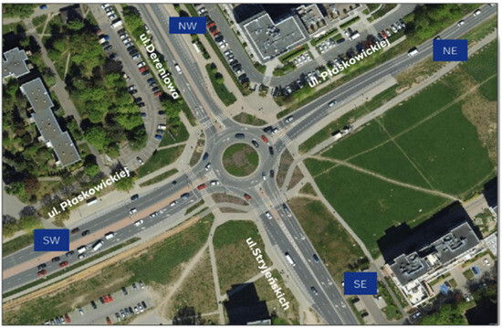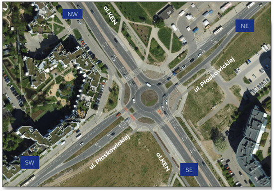 Roundabout 1 (52.145412, 21.051792) was designated as Intersection 47 for the purposes of this study. This roundabout consists of the following: NW (Komisji Edukacji Narodowej Avenue)—two traffic lanes on the approach, including one lane for straight and right turns, and one lane for straight and left turns; NE (Płaskowickiej Street)—two traffic lanes on the approach, including an additional, dedicated lane for right turns, and one lane for straight, right, and left turns; SE (Komisji Edukacji Narodowej Avenue)—two traffic lanes on the approach, including one lane for straight and right turns, and one lane for straight and left turns; SW (Płaskowickiej Street)—two traffic lanes on the approach, including an additional, dedicated lane for straight, right, and left turns, and one lane for right turns. Pedestrian crossings are present at each approach. Bicycle crossings are located at the SW (Płaskowickiej Street) and SE (Komisji Edukacji Narodowej Avenue) approaches. A visual representation of the roundabout is shown in the diagram below—Figure 2.