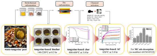 Despite these promising developments, research on utilizing waste tangerine peels as a precursor for AC production especially for MC removal remains limited. In this study, waste tangerine-based AC was produced using a chemical activation (alkaline treatment) method, and the pore characteristics of AC were systematically investigated according to activation treatment conditions. By leveraging the unique properties of tangerine peel waste, this study provides a sustainable and economically viable solution for VOC management. The overall schematic of the manufacturing process is outlined in Figure 1. As shown in Figure 1, discarded tangerine peels are converted into tangerine-based biochar through the hydrothermal carbonization (HTC) process. This process is conducted at a temperature range of 140–220 °C for approximately 0.5 h. The resulting biochar is further transformed into tangerine peel-derived carbon through a dry carbonization (D-C) process. The carbonized product, with an enhanced fixed carbon content, can then be applied as activated carbon for MC removal through chemical activation.