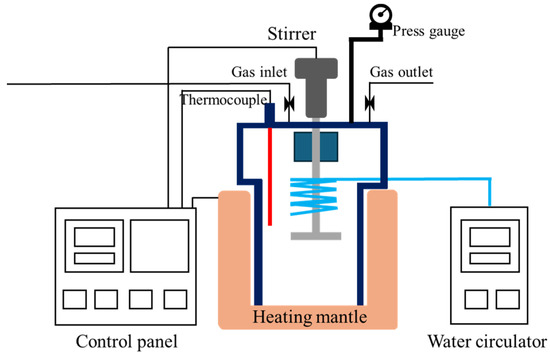 A two-step carbonization process was conducted in this study to obtain structurally stable tangerine-based char (T-C). Initially, a hydrothermal carbonization (HTC) process was performed to remove the extract from the slurry state of the W-T. The HTC reaction conditions involved heat treatment of 1 kg of W-T in slurry form within a temperature range of 140–220 °C, with a reaction time maintained for 0.5 h. The HTC reaction was conducted using the equipment shown in Figure 2. The tangerine-based biochar samples with HTC at 140–220 °C treated were dried overnight at 105 °C. The produced HTC-based samples were named T-HTC-140, 160, 180, 200, and 220 based on the HTC treatment temperature [19].
