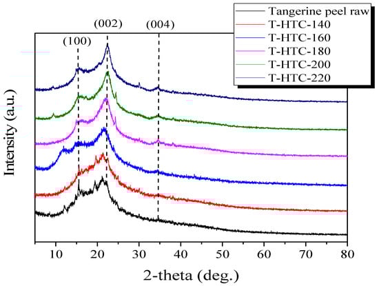 In the case of tangerine peel raw and T-HTC-140, 16° (100) and 22° (220) are clearly indistinguishable XRD patterns, which means relatively low crystallinity. On the other hand, from the HTC temperature of 160 °C, the two peaks were clearly differentiated, and an additional 34.5° (004) peak was observed, indicating that the HTC has changed to the cellulose-A type.